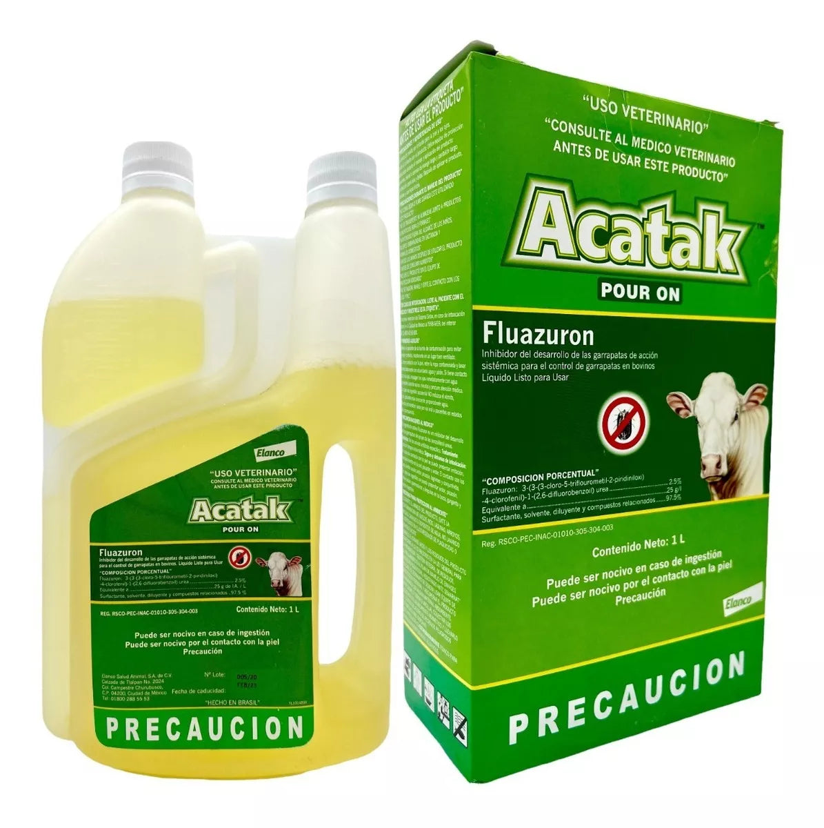 Composición: Contiene Fluazurón al 2.5% listo para usar. Acción: Inhibidor del desarrollo de garrapatas. Indicaciones: Indicado para el control estratégico de garrapatas en ganado bovino de engorde y cría. Poder residual: El poder residual absoluto de ACATAK Pouron es de 41 días, ofreciendo protección continua durante este período. Protección prolongada: Aplicado cuando la carga parasitaria es baja o nula, brinda protección contra garrapatas adultas por al menos 8 semanas, y hasta 12 semanas en ciertas condiciones climáticas y ambientales. No es necesario tratar terneros de madres que están siendo tratadas con ACATAK Pouron. Protección de los animales: Protege a los animales contra la infestación de garrapatas durante 8-12 semanas, aunque este período puede ser menor en algunas circunstancias específicas.