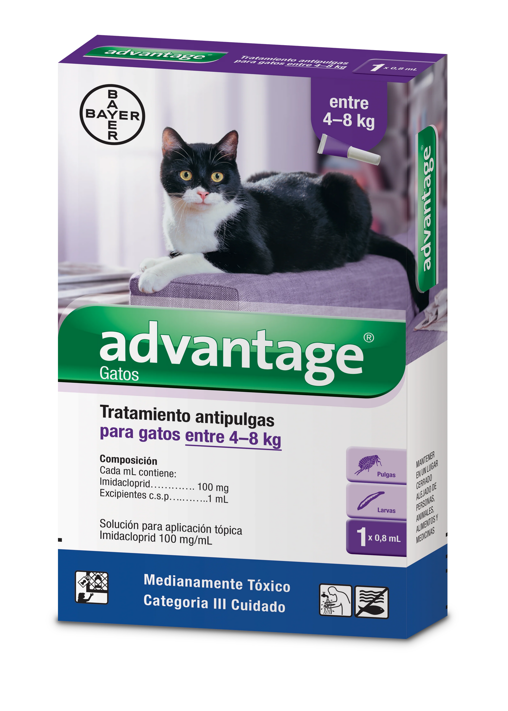 ADVANTAGE es un pulguicida, está indicado en el tratamiento y control de infestaciones de pulgas (Ctenocephalides spp.) en gatos. Después de la aplicación, la grasa natural del pelaje y los movimientos del animal distribuyen la dosis sobre toda la superficie corporal, eliminando el 100 % de las pulgas durante las primeras 12 horas.