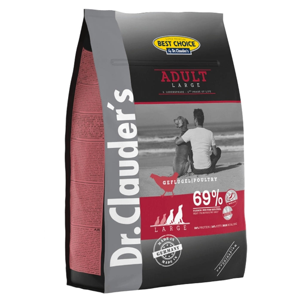 Dr. Clauder's BEST CHOICE Adult Large es un alimento completo y equilibrado, formulado especialmente para perros adultos de razas grandes y muy grandes (>25 kg de peso adulto). Este alimento está enriquecido con pollo como única fuente de proteína animal, y cuenta con concentrado de mejillón de labio verde y glucosamina para mantener las articulaciones fuertes y saludables. No contiene trigo ni gluten y está libre de conservantes artificiales, garantizando así una dieta natural y segura para tu perro.