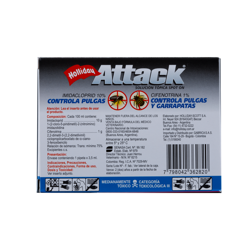 Attack es un antiparasitario de uso externo formulado para el control y tratamiento de parásitos externos como pulgas y garrapatas. Estas pipetas son muy fáciles de utilizar.