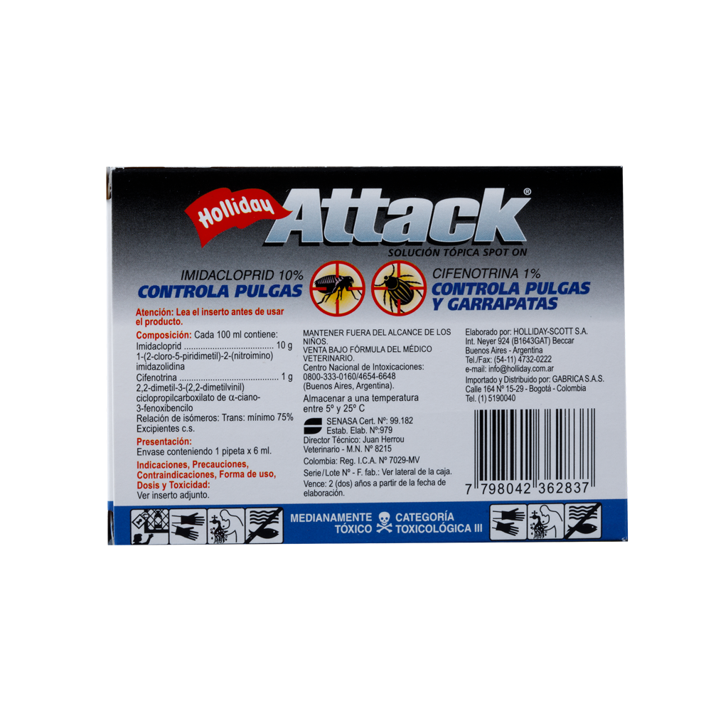 Attack es un antiparasitario de uso externo formulado para el control y tratamiento de parásitos externos como pulgas y garrapatas. Estas pipetas son muy fáciles de utilizar.