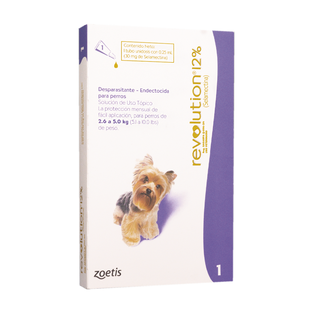 REVOLUTION 12% El ANTIPARASITARIO interno y externo para perros desde 2,6 Kg hasta 5,0 Kg de peso corporal de no menos de 6 semanas de edad. Administrado mensualmente, es un desparasitante indicado para el tratamiento y control de infestaciones por pulgas (especies de ctenocephalides), control de microfilarias del parásito Dirofilaria imitis (gusano del corazón) y el tratamiento y control de ácaros de las orejas (Otodectes cynotis) y los piojos (Trichodectes canis y Felicola subrostratus) en perros. También indicado para el tratamiento y control de los nemátodos intestinales (T. canis, Toxascaris leonina) y la sarna (sarcoptes scabiei), y como una ayuda en el control de garrapatas (Riphicelphalus sanguineus y Dermacentor variablis).