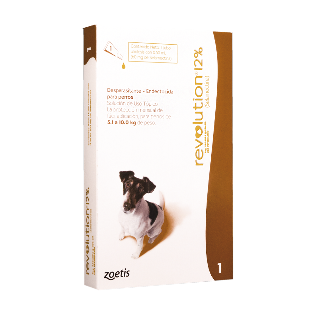 REVOLUTION 12% El ANTIPARASITARIO interno y externo para perros desde 5,1 Kg hasta 10,0 Kg de peso corporal de no menos de 6 semanas de edad. Administrado mensualmente, es un desparasitante indicado para el tratamiento y control de infestaciones por pulgas (especies de ctenocephalides), control de microfilarias del parásito Dirofilaria imitis (gusano del corazón) y el tratamiento y control de ácaros de las orejas (Otodectes cynotis) y los piojos (Trichodectes canis y Felicola subrostratus) en perros. También indicado para el tratamiento y control de los nemátodos intestinales (T. canis, Toxascaris leonina) y la sarna (sarcoptes scabiei), y como una ayuda en el control de garrapatas (Riphicelphalus sanguineus y Dermacentor variablis).