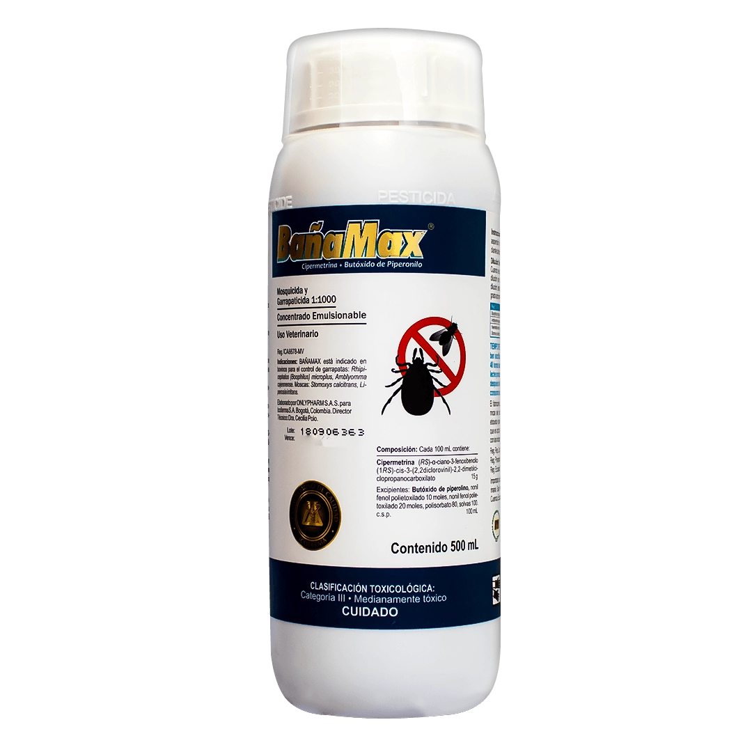 Bañamax es un poderoso baño insecticida concentrado, formulado en emulsión para el control, prevención y tratamiento de parasitosis externas en bovinos. Su fórmula combina cipermetrina y butóxido de piperonilo, ofreciendo una acción efectiva contra organismos sensibles a la cipermetrina y garrapatas. Este producto puede aplicarse tanto diluido en agua como en forma pour-on, mezclado con aceite mineral. Ideal para mantener a tus bovinos libres de parásitos y en óptimas condiciones de salud.