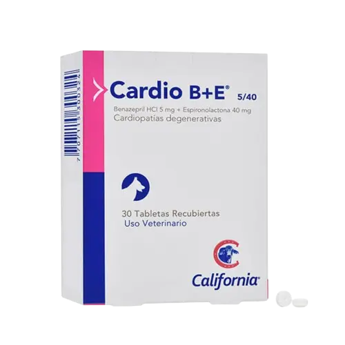 CARDIO B + E CAJA X 30 TAB es un antihipertensivo de la clase IECA (inhibidor de la enzima convertidora de angiotensina) que contiene benazepril en tabletas de 5 mg. Está diseñado específicamente para el tratamiento de cardiopatías y enfermedades renales en perros y gatos, proporcionando una solución efectiva para mejorar la calidad de vida de las mascotas.