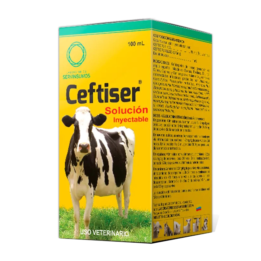 Ceftiser es un antibiótico cefalosporínico de última generación, formulado con Ceftiofur clorhidrato, eficaz contra bacterias gram positivas y gram negativas. Indicado para el tratamiento de infecciones respiratorias, podales, metritis, infecciones urinarias, digestivas y de piel en bovinos, porcinos, equinos, ovinos, caprinos y caninos. No requiere tiempo de retiro para el consumo de la leche, lo que lo hace ideal en la etapa productiva del ganado.