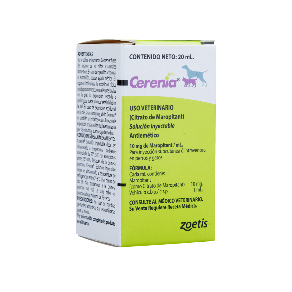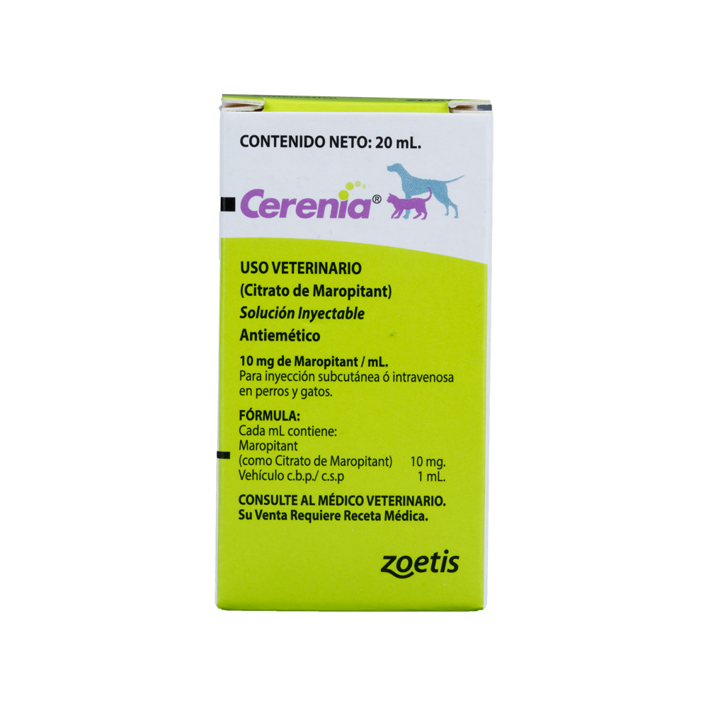 CERENIA primer antiemético de uso veterinario exclusivo para caninos y felinos. CERENIA Solución Inyectable es un antagonista del receptor de la neurokinina-1 (NK-1) que actúa inhibiendo la unión de la Sustancia P, neurotransmisor clave involucrado en el vómito.