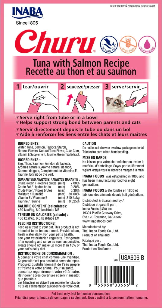 Churu Salmón es una opción de alimento para gatos en forma de pasta, desarrollado por la marca Inaba. Esta deliciosa pasta en tubo combina salmón de alta calidad en una textura suave y atractiva para los felinos. Puede ser ofrecida como premio, recompensa, para administrar medicamentos o simplemente como un regalo especial. Además de su sabor apetitoso, Churu proporciona hidratación adicional, lo cual es importante para la salud de los gatos. Aunque es un tentempié que los gatos suelen adorar, es aconsejable consultar con un veterinario antes de introducir nuevos alimentos en la dieta de tu gato.