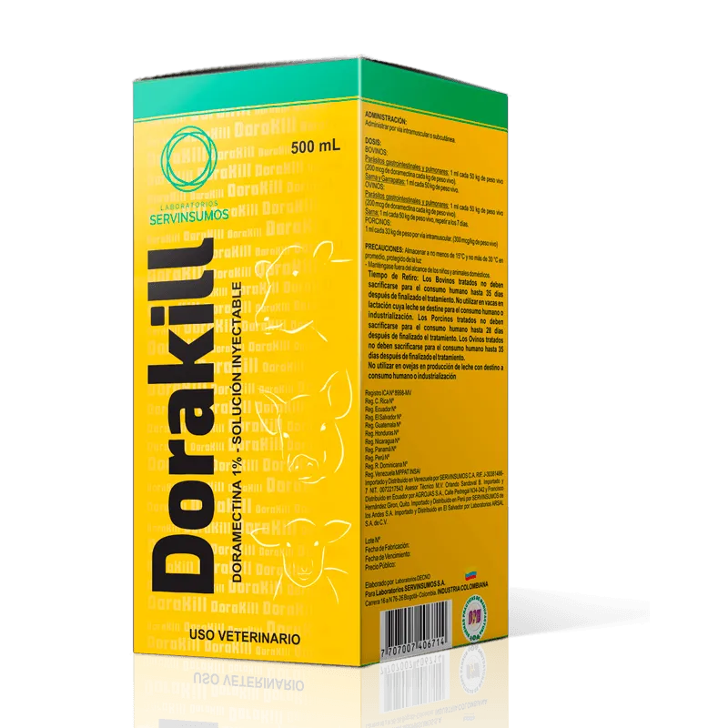 Dorakill es un antiparasitario eficaz y de larga duración que combate parásitos internos y externos en bovinos, ovinos y porcinos. Con una fórmula de doramectina, ofrece protección completa y duradera.
