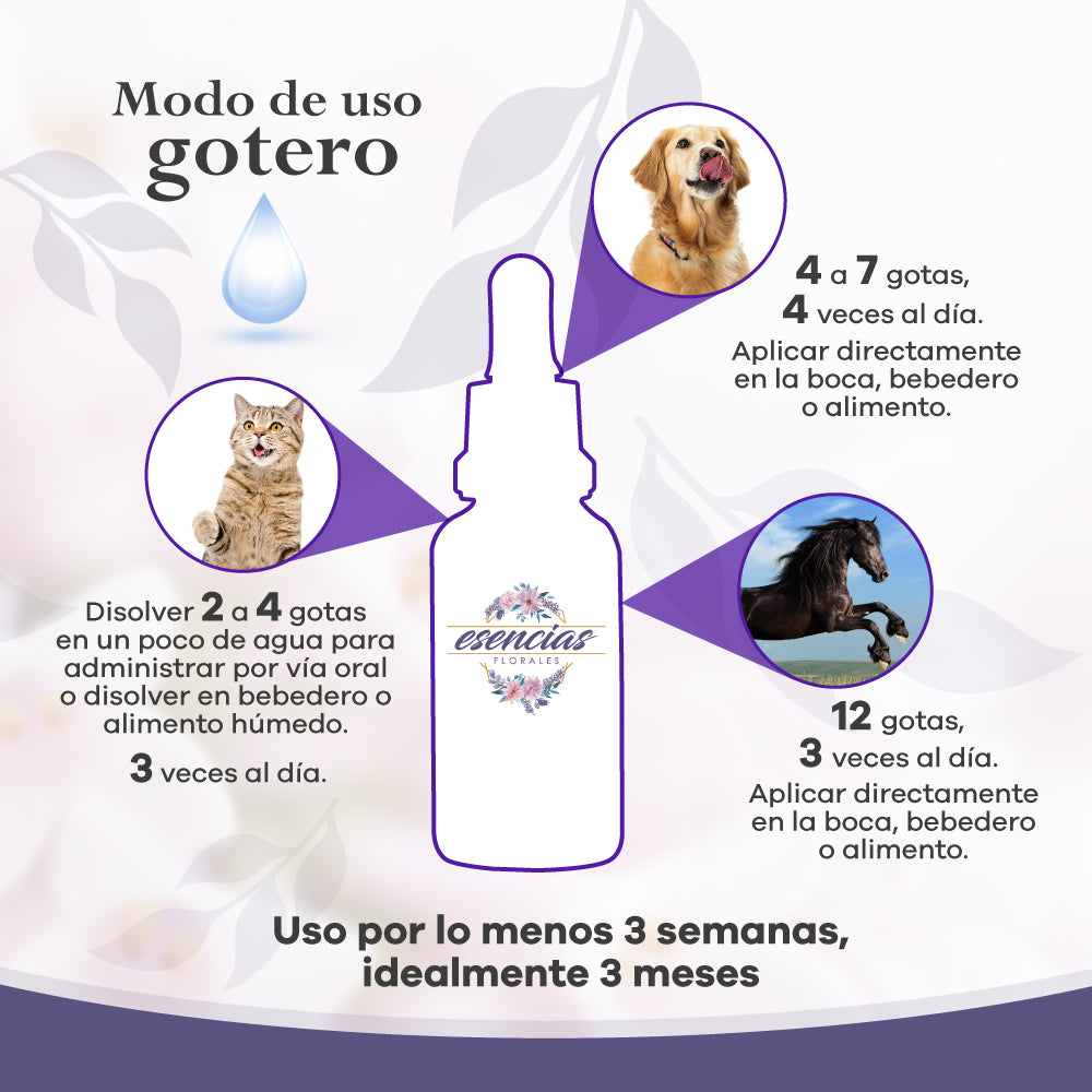 Las esencias florales son preparados vibracionales que sirven para modular los estados emocionales y armonizar el campo energético del animal.