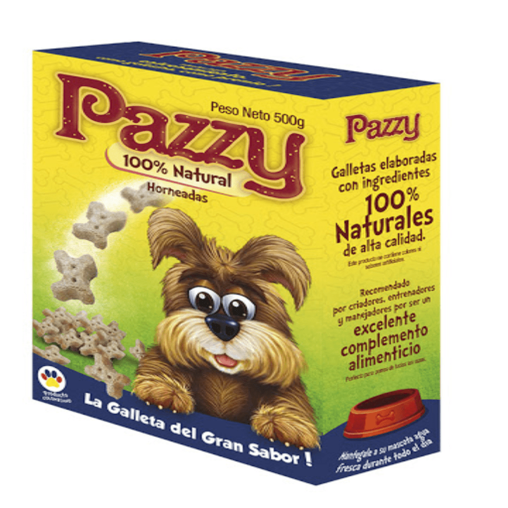 INGREDIENTES: Avena, harina integral, harina de arroz, harina de maíz, harina de trigo, hígados de pollo, huevos, aceite vegetal y panela. Galletas PAZZY, no contienen, sabores ni colores artificiales. Recomendado por criadores y manejadores de caninos, por ser un excelente suplemento alimenticio.