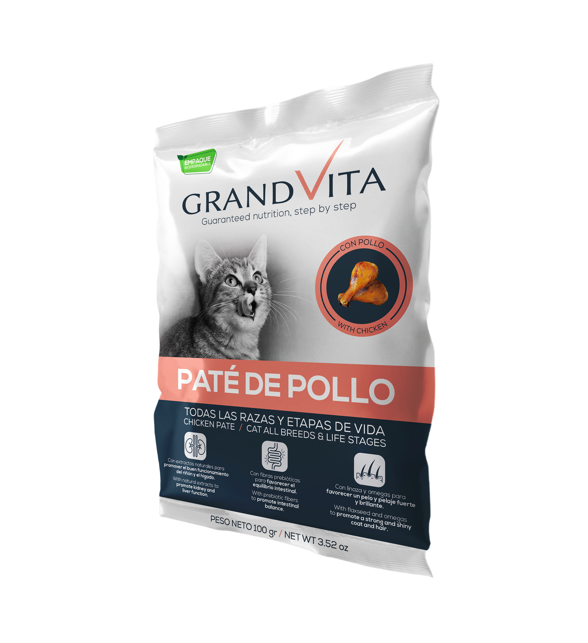 Vitalidad para tu mascota en un solo bocado; Grand Vita paté, un alimento húmedo indicado para gatos de todos los tamaños y etapas de vida, una excelente opción para complementar la alimentación diaria de las mascotas.