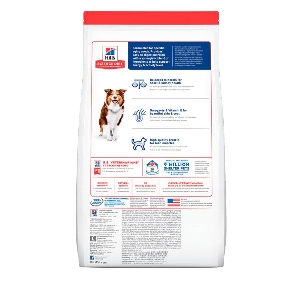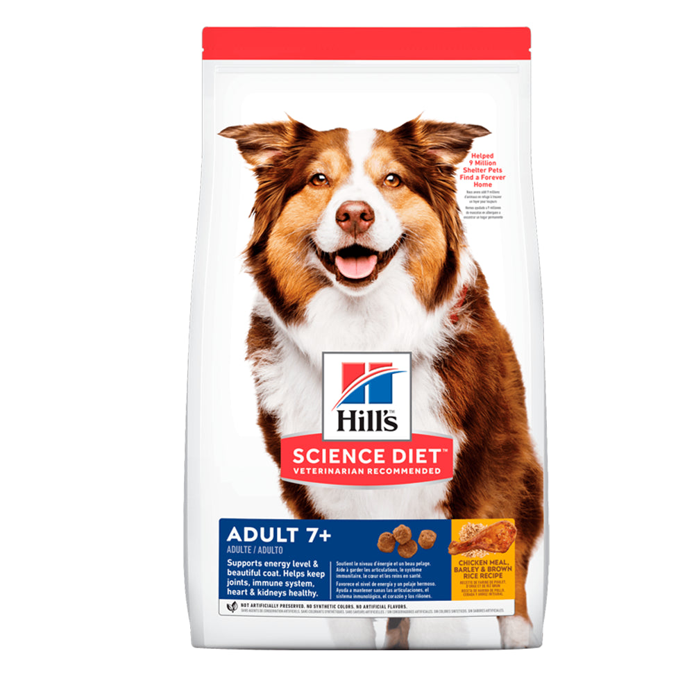 El alimento seco para perros Hill's Science Diet Adult 7+ está indicado para perros de 7 años o más de razas medianas y grandes. Sin colores, sabores o conservantes artificiales, con inclusión de antioxidantes para favorecer un sistema inmunológico fuerte, además de una mezcla exclusiva de ácidos grasos omega-6 y vitamina E para un pelaje brillante.