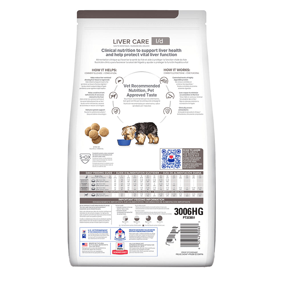El hígado de su perro es su órgano interno más grande con muchas funciones, incluyendo la digestión y conversión de nutrientes, eliminación de substancias tóxicas de la sangre y almacenamiento de vitaminas y minerales. Hills Prescription Liver Care contiene aminoácidos de cadena ramificada para reducir la acumulación de desechos nitrogenados y Vitamina K y zinc para compensar las deficiencias de estos nutrientes.