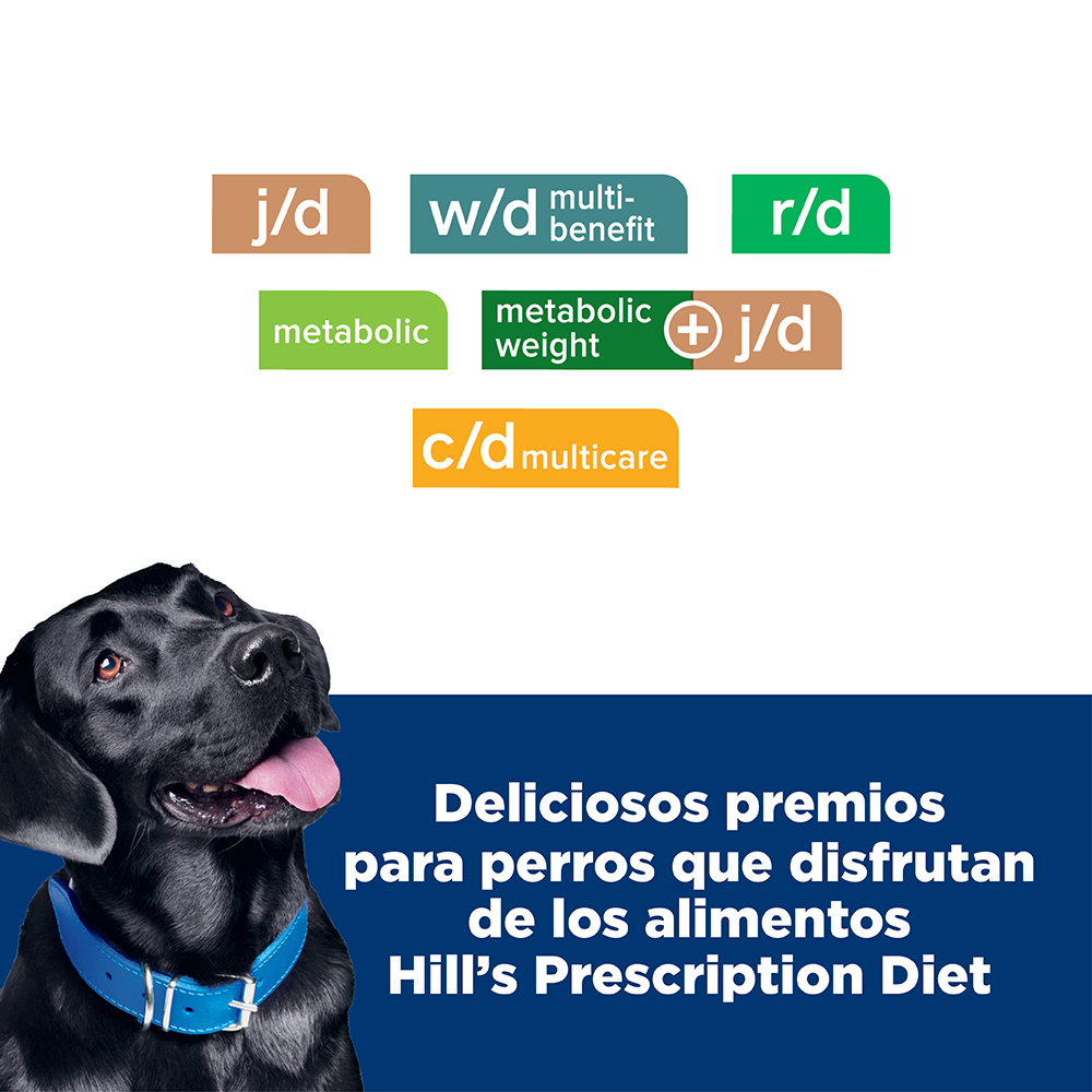 Los snack metabólicos Prescription Diet® son golosinas sabrosas, saludables y gratificantes para perros adultos para apoyar la pérdida de peso saludable y el mantenimiento del peso.