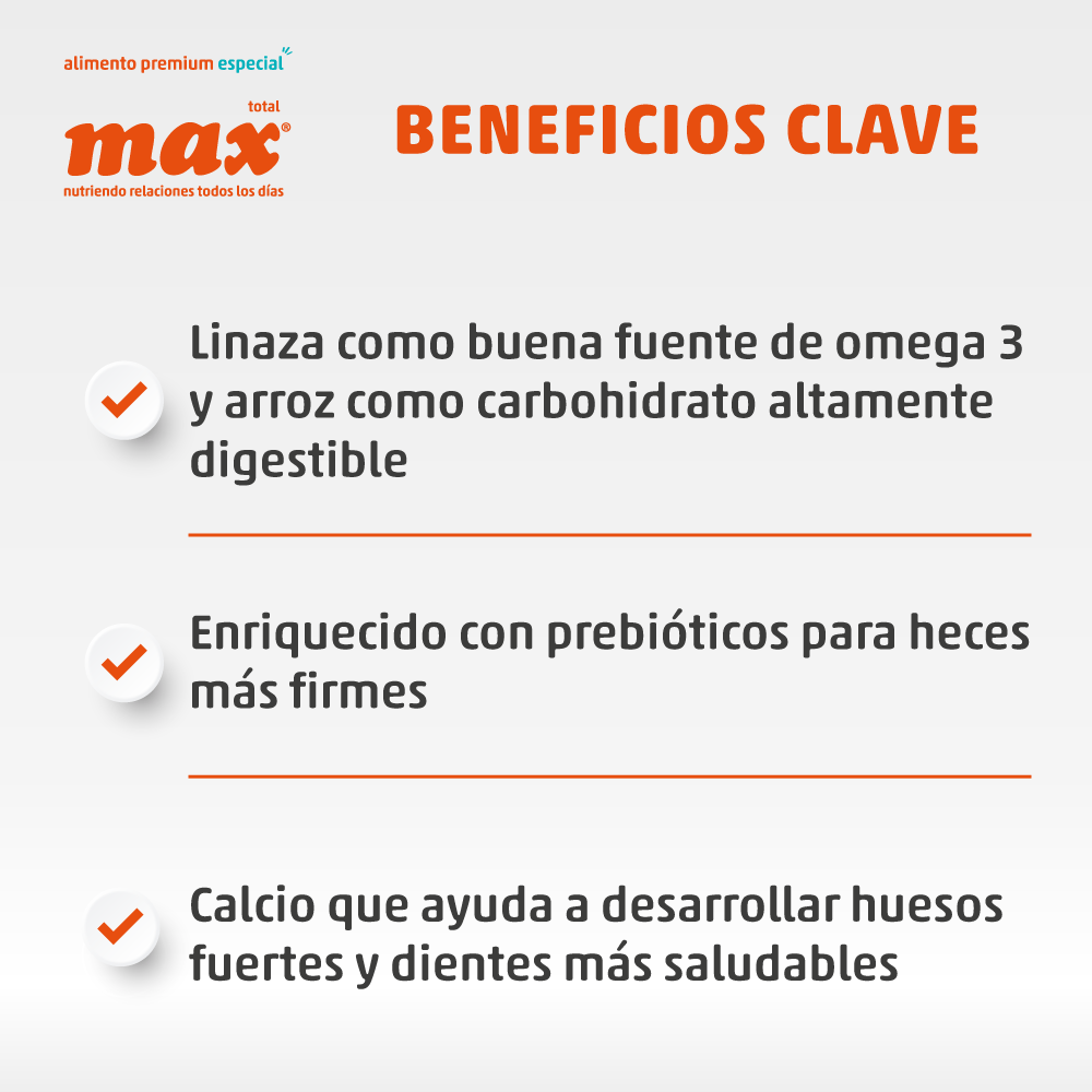 Alimento completo para perros cachorros. Contiene pollo, arroz (Fuente de carbohidratos) y linaza(Fuente de omega 3). Alimento sin colorantes ni aromatizantes artificiales.