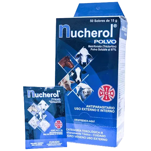 Nucherol polvo es un antiparasitario externo e interno formulado para una amplia variedad de animales, incluyendo bovinos, ovinos, caprinos, porcinos, equinos, caninos y aves. Este producto contiene triclorfón (metrifonato) al 97%, un organofosforado eficaz contra ectoparásitos y endoparásitos. NUCHEROL POLVO se puede utilizar en baños de aspersión para el control de ectoparásitos y como tratamiento oral para endoparásitos, así como para el tratamiento del entorno e instalaciones.