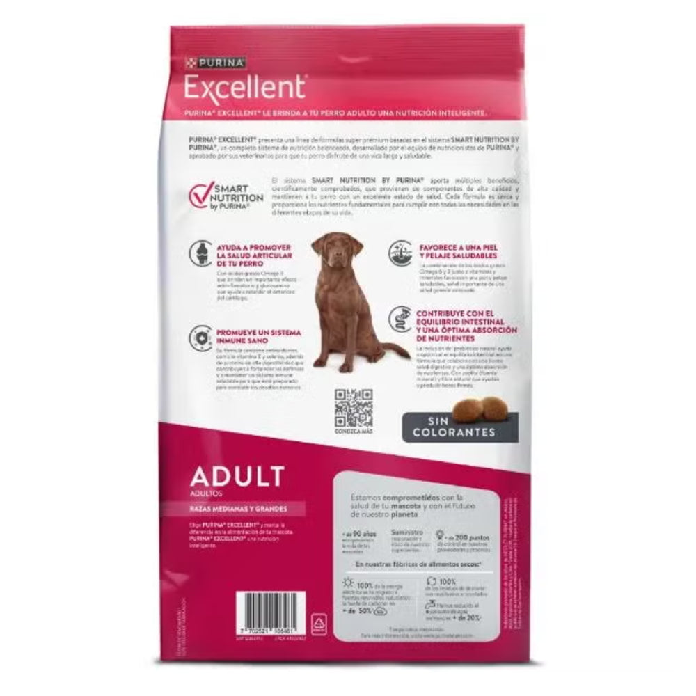Alimento completo para perros adultos de razas medianas y grandes. PURINA® EXCELLENT presenta una linea de formulas super premium basadas en el exclusivo sistema SMART NUTRITION BY PURINA®. Un completo sistema de nutrición balanceada, desarrollada por el equipo de nutricionistas de PURINA® y aprobado por sus veterinarios para que el perro disfrute de una vida larga y saludable.