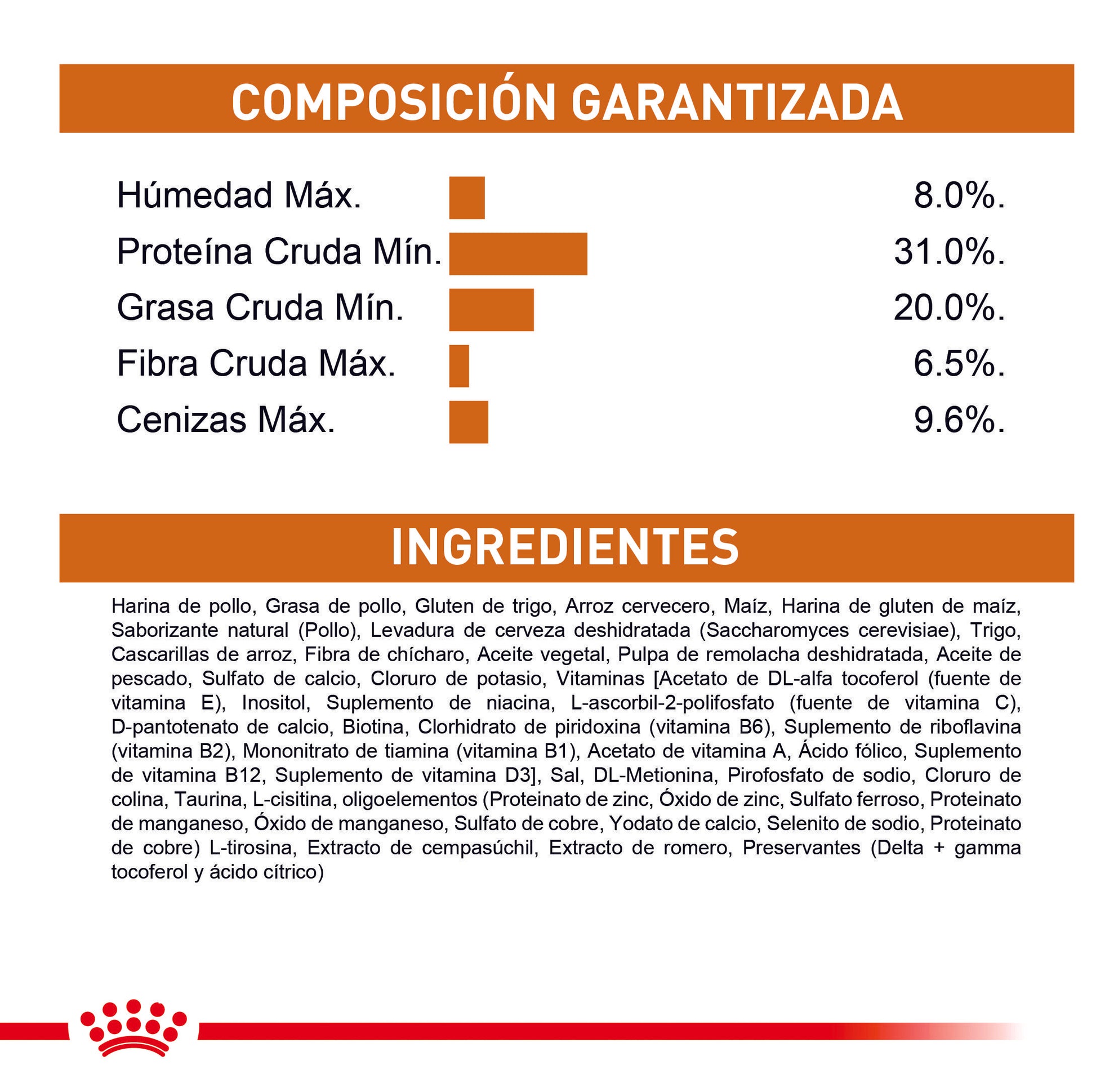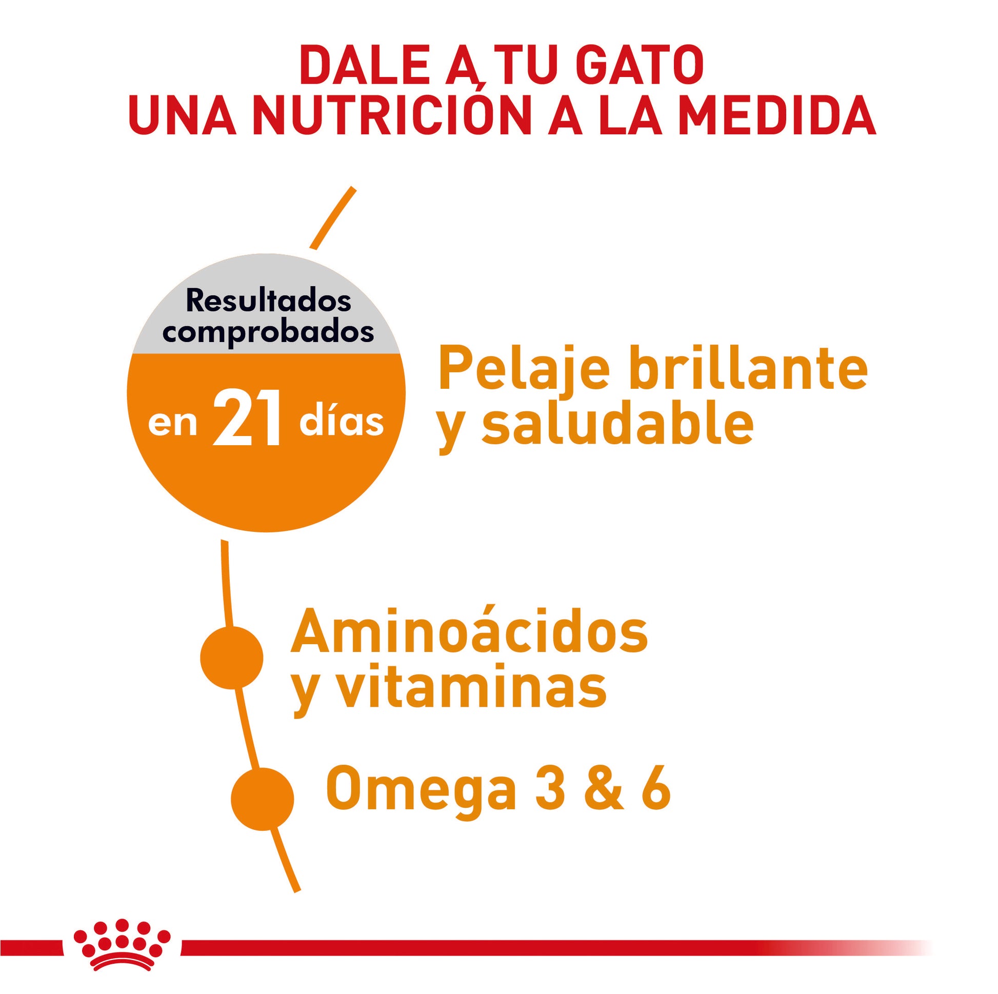 Royal Canin Hair and Skin Care para gatos es un alimento seco diseñado para promover la salud óptima de la piel y el pelaje de los felinos. Esta fórmula nutricionalmente equilibrada se centra en abordar problemas dermatológicos y mejorar la calidad del pelaje. Los ingredientes seleccionados, como ácidos grasos omega-3 y omega-6, zinc y biotina, trabajan en conjunto para fortalecer la barrera cutánea, reducir la irritación y favorecer un pelaje brillante y saludable. Este alimento puede ser beneficioso para gatos con piel sensible, reacciones alérgicas o problemas de pelaje opaco. Además, puede ayudar a reducir la pérdida excesiva de pelo y contribuir al bienestar general de tu gato. La fórmula también puede incluir proteínas de alta calidad para mantener la masa muscular y otros nutrientes esenciales para respaldar la salud digestiva y el sistema inmunológico.