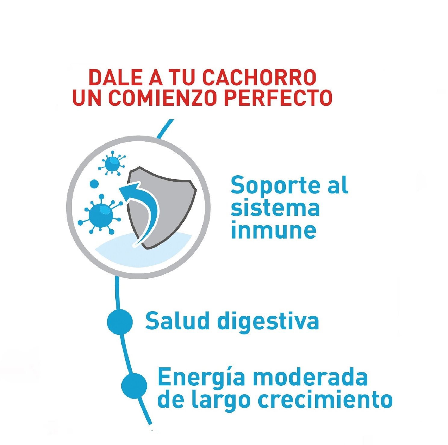 Responde a las necesidades energéticas moderadas de los cachorros de tamaño grande que tienen un período de crecimiento largo.