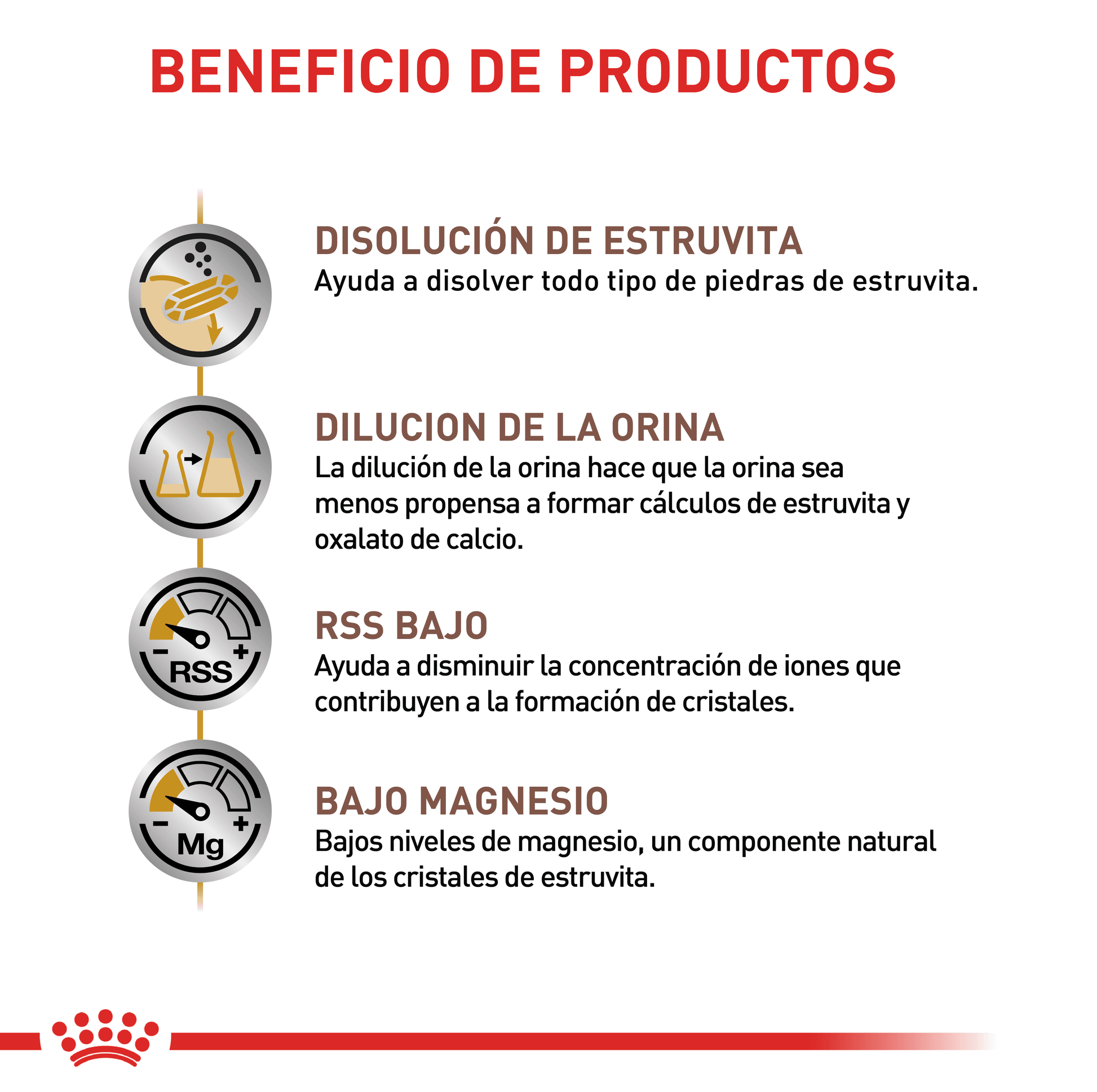 La Súper Saturación Relativa (RSS), previene el potencial de cristalización de la orina. RSS se utiliza en esta dieta para controlar la formación de cristales de estruvita y oxalato de calcio.