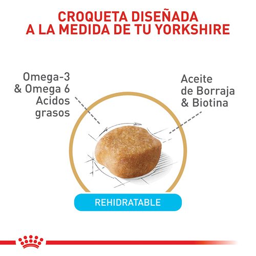 La croqueta tiene una forma, tamaño, textura y densidad únicos adaptados a la pequeña mandíbula del Yorkshire Terrier, es rehidratable y ayuda a reducir la formación de sarro al alentar a su perro anciano a masticar.