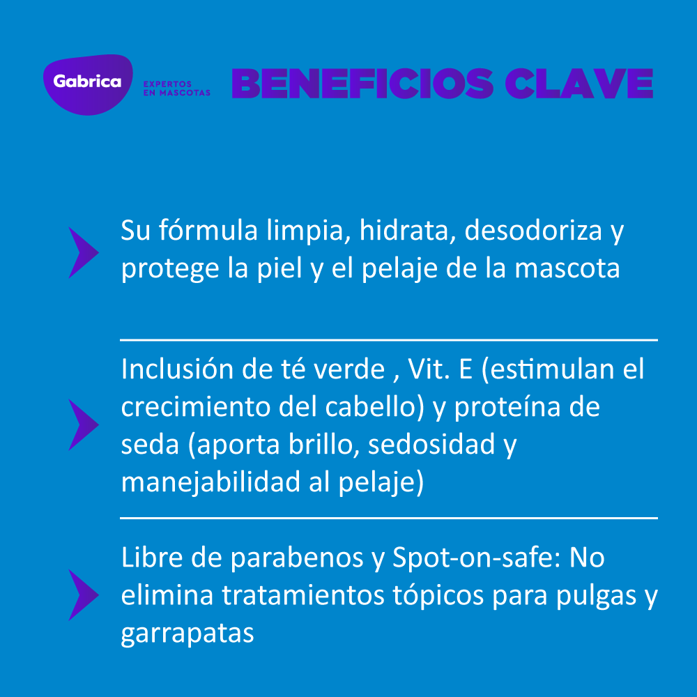 2. Inclusión de té verde , Vit. E (estimulan el crecimiento del cabello) y proteína de seda (aporta brillo, sedosidad y manejabilidad al pelaje)