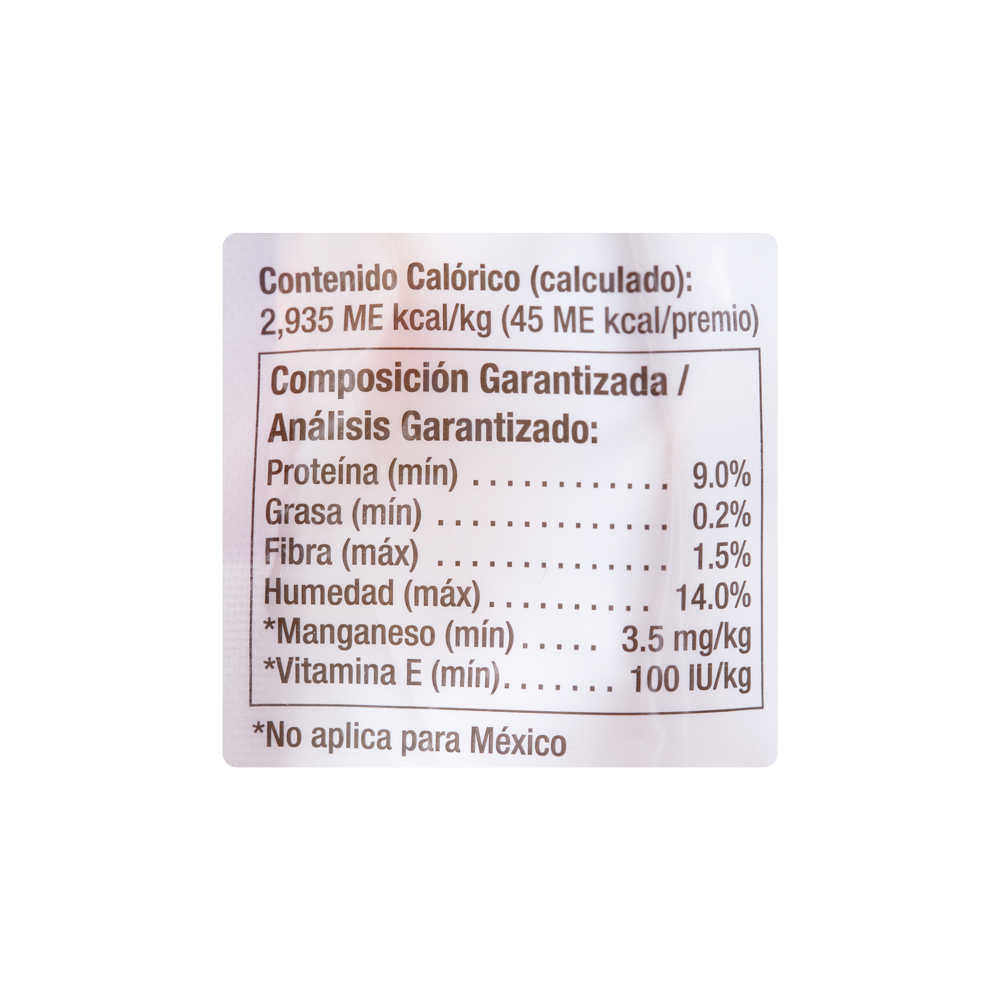 Amidones (almidón de maíz), carne de pollo (pechuga de pollo), grenetina de cerdo (gelatina de cerdo), humectantes (maltodextrina), azúcares (sorbitol, fructosa, jarabe de malta de cebada) vegetales deshidratados molidos (proteina de chicharo/guisantes, harina de camote, harina de zanahoria, harina de chicharo/guisantes), sal, dióxido de titanio, monoestearato de glicerol (glicerina), gomas (goma de xantana), saborizantes artificiales y/o naturales de origen animal y/o vegetal (sabor artificial de pollo, sabor artificial a leche -aceite de soya,ácido dodecanoico-) fosfatos (fosfato dicálcico, pirofosfato de sodio tripolifosfato de sodio), minerales (sulfato ferroso, sulfato de manganeso, sulfato de zinc), conservadores/conservantes (sorbato de potasio, propionato de sodio), vitaminas (pantotenato de calcio, vitamina E, tiamina, piridoxina, niacinamida, Vitamina B12, riboflavina), colorantes artificiales y/o naturales de origen animal y/o vegetal (Rojo #40).