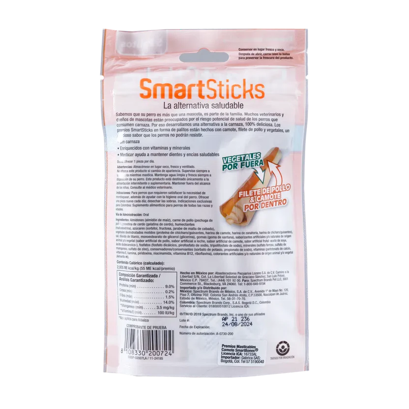 El hueso premium smartbones de patatas dulces, pollo y verduras saludables, es una golosina de textura blanda, con vitaminas y minerales enriquecidos, libre de cuero crudo.