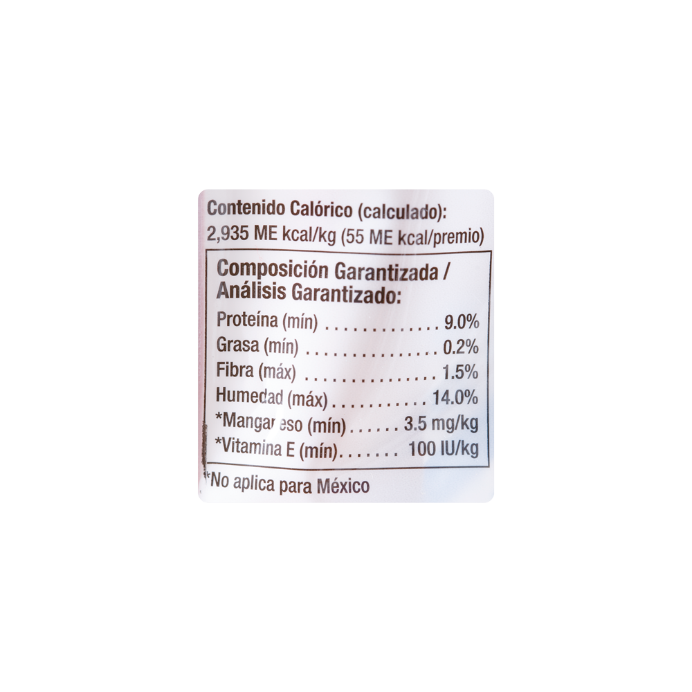 Amidones (almidón de maíz), carne de pollo (pechuga de pollo), grenetina de cerdo (gelatina de cerdo), humectantes (maltodextrina), azúcares (sorbitol, fructosa, jarabe de malta de cebada) vegetales deshidratados molidos (proteina de chicharo/guisantes, harina de camote, harina de zanahoria, harina de chicharo/guisantes), sal, dióxido de titanio, monoestearato de glicerol (glicerina), gomas (goma de xantana), saborizantes artificiales y/o naturales de origen animal y/o vegetal (sabor artificial de pollo, sabor artificial a leche -aceite de soya,ácido dodecanoico-) fosfatos (fosfato dicálcico, pirofosfato de sodio tripolifosfato de sodio), minerales (sulfato ferroso, sulfato de manganeso, sulfato de zinc), conservadores/conservantes (sorbato de potasio, propionato de sodio), vitaminas (pantotenato de calcio, vitamina E, tiamina, piridoxina, niacinamida, Vitamina B12, riboflavina), colorantes artificiales y/o naturales de origen animal y/o vegetal (Rojo #40).
