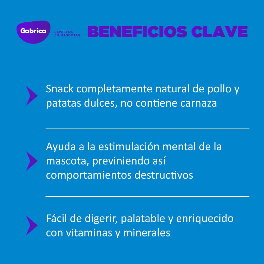 Es un hueso golosina de textura blanda, con vitaminas y minerales enriquecidos, libre de cuero crudo.