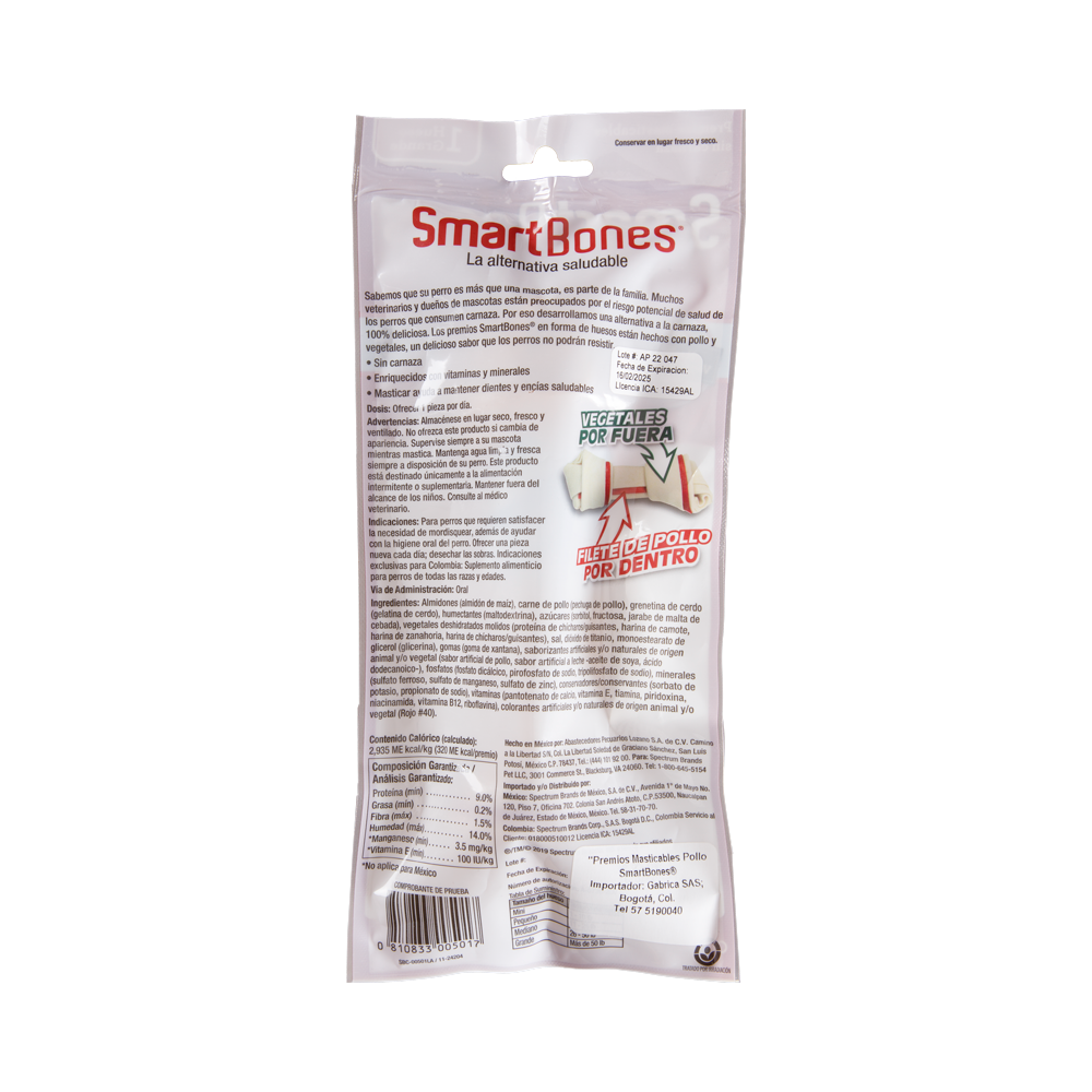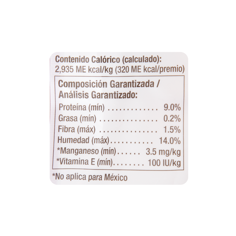 Amidones (almidón de maíz), carne de pollo (pechuga de pollo), grenetina de cerdo (gelatina de cerdo), humectantes (maltodextrina), azúcares (sorbitol, fructosa, jarabe de malta de cebada) vegetales deshidratados molidos (proteina de chicharo/guisantes, harina de camote, harina de zanahoria, harina de chicharo/guisantes), sal, dióxido de titanio, monoestearato de glicerol (glicerina), gomas (goma de xantana), saborizantes artificiales y/o naturales de origen animal y/o vegetal (sabor artificial de pollo, sabor artificial a leche -aceite de soya,ácido dodecanoico-) fosfatos (fosfato dicálcico, pirofosfato de sodio tripolifosfato de sodio), minerales (sulfato ferroso, sulfato de manganeso, sulfato de zinc), conservadores/conservantes (sorbato de potasio, propionato de sodio), vitaminas (pantotenato de calcio, vitamina E, tiamina, piridoxina, niacinamida, Vitamina B12, riboflavina), colorantes artificiales y/o naturales de origen animal y/o vegetal (Rojo #40).