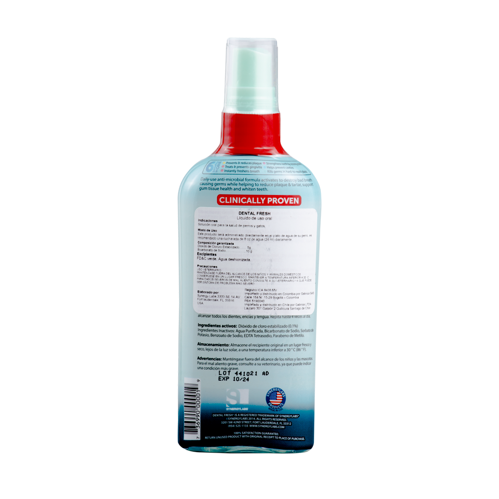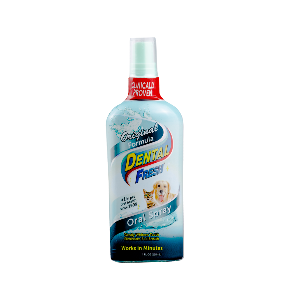 Rocíe Dental Fresh® en la boca de la mascota asegurándose de saturar todos los dientes, encías, lengua y áreas difíciles de alcanzar. Repita según sea necesario. No lo use más de 4 veces al día. Para obtener los mejores resultados, úselo con otros productos de Dental Fresh® para el agua.