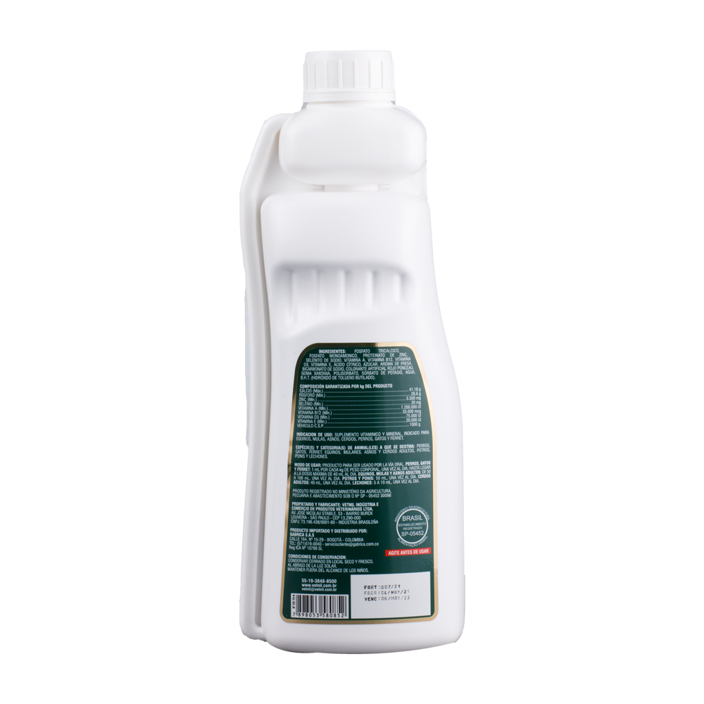 Calcio oral, que contiene los elementos principales para el crecimiento ideal de los animales. Su formulación contiene calcio, fósforo, zinc, selenio, vitamina E, vitamina A, vitamina B12 y vitamina D3, balanceados para cubrir las necesidades nutricionales de los animales.